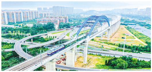 9月15日,检测列车驶过济莱高铁历城站特大桥(无人机照片)。