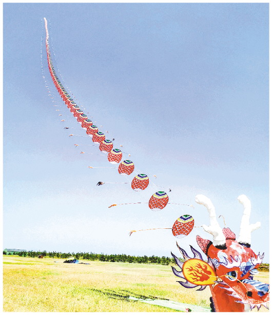 在牵牛花长串风筝的旁边,另一只画有日出图案的长串风筝与之交相辉映,远远望去,宛如两条蛟龙在云端嬉戏竞逐。它们将长串风筝的轻盈、灵动之美表现得淋漓尽致,也展现出放飞者高超的水平。