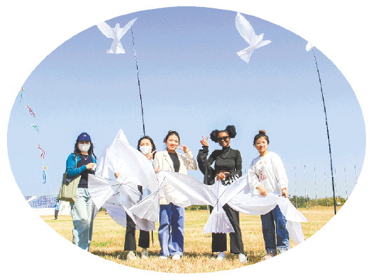 ◥外国留学生与现场观众一同放飞和平鸽风筝。 潍坊日报社全媒体记者 陈艺嘉 摄