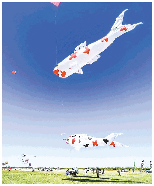 ▲锦鲤风筝翱翔蓝天。潍坊日报社全媒体记者 李小龙 摄