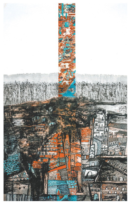日月交替,烟云往复,笔墨混沌,灵明觉心,构思造景逐能一一抖落浮华。树木恣意,云朵徜徉,楼亭庙宇欲正还斜,一切皆有生命之灵光。予喜以笔法取意,墨法成章,纵有画面氤氲之大美,则视为满意之作,时而得意忘形,时而羞愧掩面,每每皆有悔意。今出个展作回顾,作总结,更作起点,故写数语以为序,以博一笑。