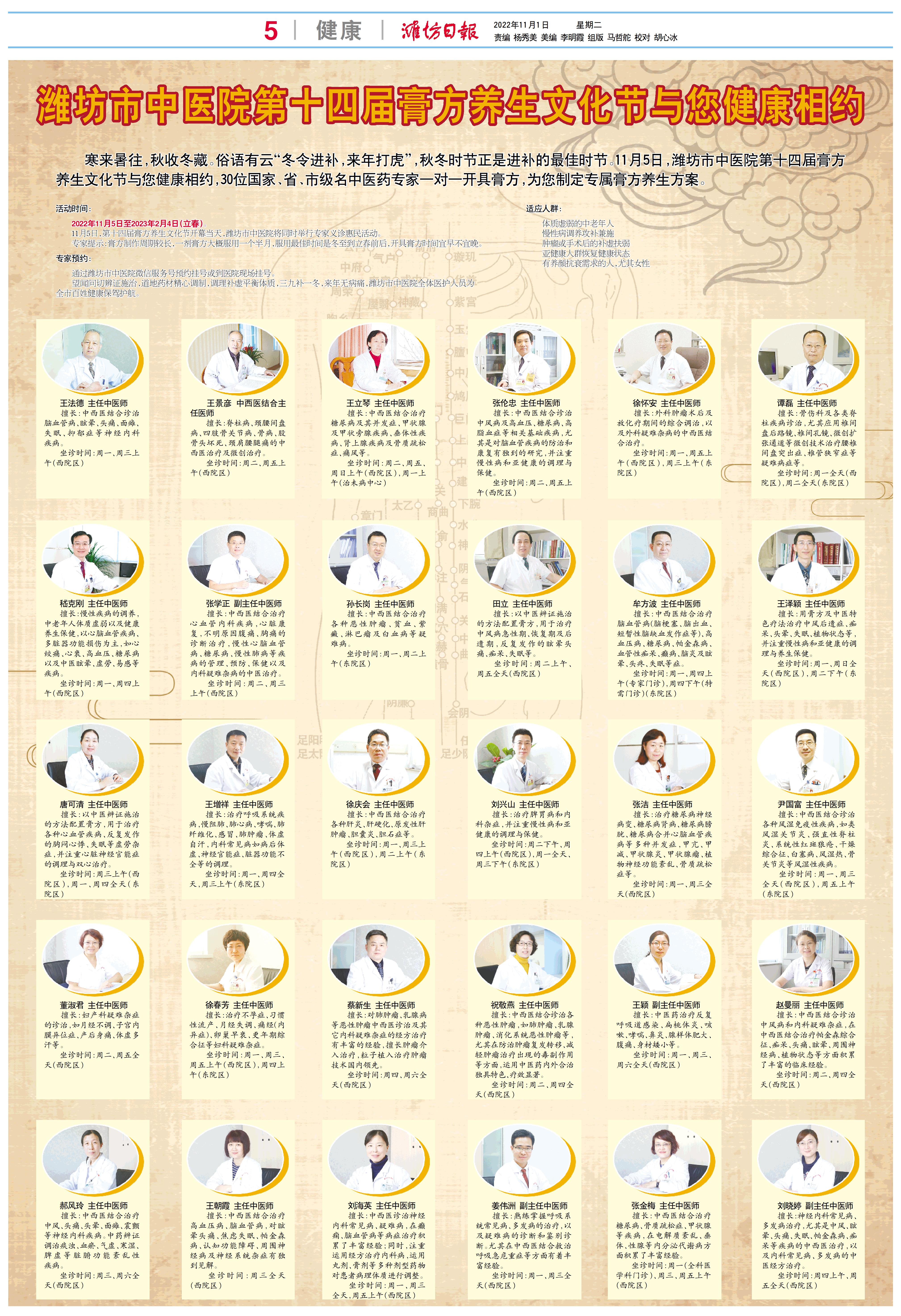 11月5日,第十四届膏方养生文化节开幕当天,潍坊市中医院将同时举行专家义诊惠民活动。