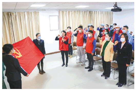 11月11日,奎文区新业态新就业群体党的二十大精神宣讲活动在奎文区东关街道奎文门社区举行,并现场举行了“二十大精神理论包”赠送仪式。图为参加活动的党员代表在党旗下宣誓,重温入党誓词。