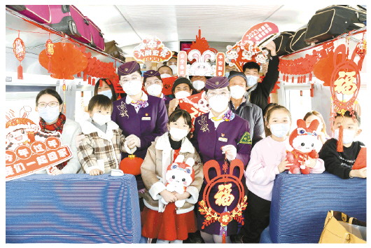1月7日,旅客和乘务员在G1373次列车上拿着新年装饰品合影留念。当日,2023年春运正式开启。铁路、道路运输、民航等部门采取多种举措,在做好疫情防控工作的同时,强化春运服务和安全管理,确保广大旅客平安有序温馨出行。2023年春运从1月7日开始,至2月15日结束,共40天。 (新华社发)