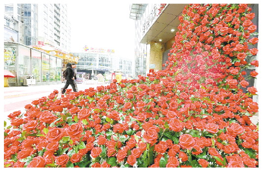 2月9日,在奎文区南下河街,行人从“玫瑰花瀑布”前经过。当日,一组由近万支“玫瑰花”组成的艺术景观亮相该路段,4米多高的梯架上铺满了“玫瑰花”,倾泻而下形似一条瀑布,红色花朵颜色浓烈,形成富有视觉冲击力的街头景观,吸引了众多市民驻足观赏。