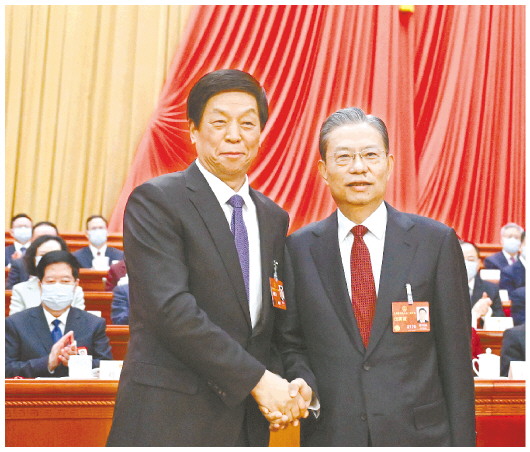 三月十日,十四届全国人大一次会议在北京人民大会堂举行第三次全体会议。赵乐际当选为第十四届全国人民代表大会常务委员会委员长。这是赵乐际同十三届全国人大常委会委员长栗战书握手,相互致意。 (新华社发)