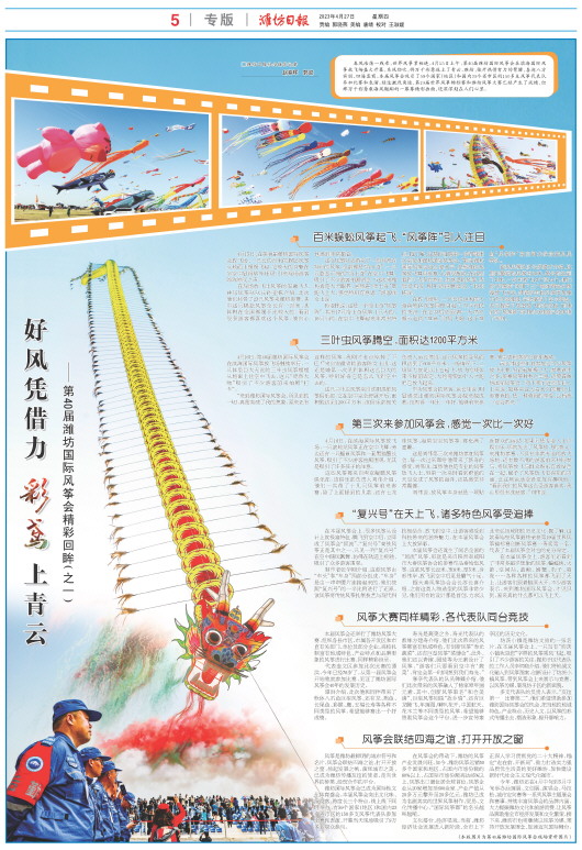 潍坊国际风筝会已成为国际性文化体育盛会。本届风筝会突出文化味、沉浸感、跨度长三个特点,线上线下同时举办,有59个国家(地区)和国内23个省市区的150多支风筝代表队参加比赛和表演,开幕当天现场吸引了9万多名观众参与。