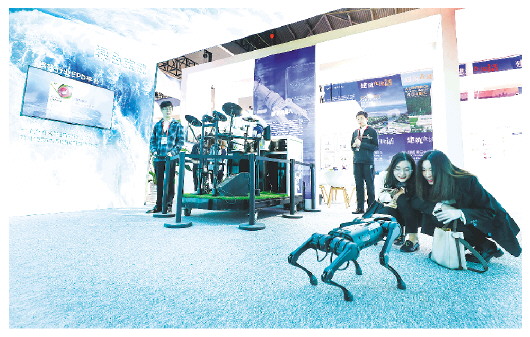 5月10日,参观者在中国宝武展台上与一个四足机器人互动。当日,2023年中国品牌博览会在上海世博展览馆拉开帷幕。在近6万平方米的上海世博展览馆内,围绕活动主题设置主题展区、综合展区和专题展区,1000家左右的品牌企业汇聚一堂,向世界传递中国品牌新势能。 (新华社发)