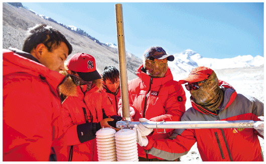 在珠峰登山大本营附近,科考登顶队员学习如何架设自动气象站(5月9日摄)。