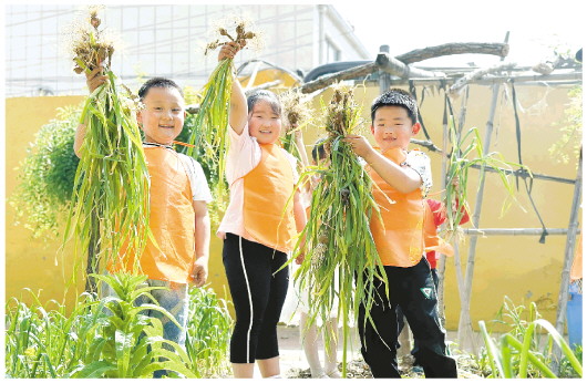 近年来,滨海区央子幼儿园扎实推进劳动教育,从幼儿的年龄特点出发,以“浸润”式劳动课程为核心,创新劳动教育的内容,将劳动教育渗透进幼儿一日生活中,让幼儿在劳动中成长。图为幼儿在学校“一亩菜园”种植角,体验收获大蒜的喜悦。