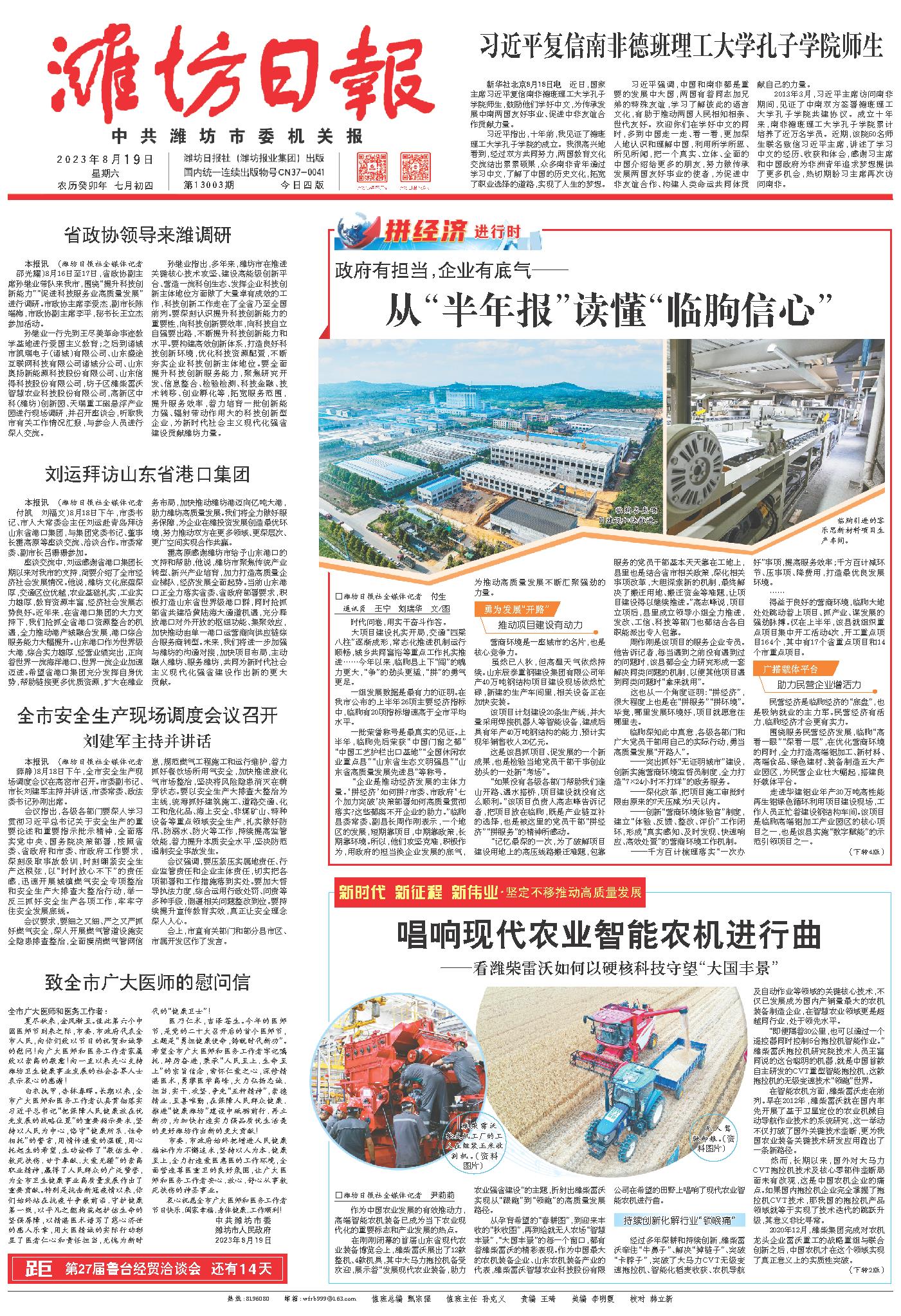 全国农机看山东,山东农机看潍坊。目前,潍坊的农机产业已形成以潍柴雷沃重工为龙头、从主机到零部件专业化协作和配套的产业链条,品种基本涵盖农机生产全过程的产业格局,成为全国总量最大、技术水平先进的农机产业基地。