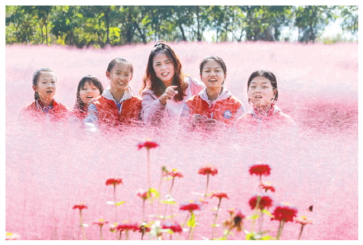 10月11日,高密市胶河社区一所学校组织孩子们来到学校周边的粉黛乱子草花田开展生态研学活动,当地大片粉黛乱子草同时开花,人们仿佛置身一片粉红色海洋。