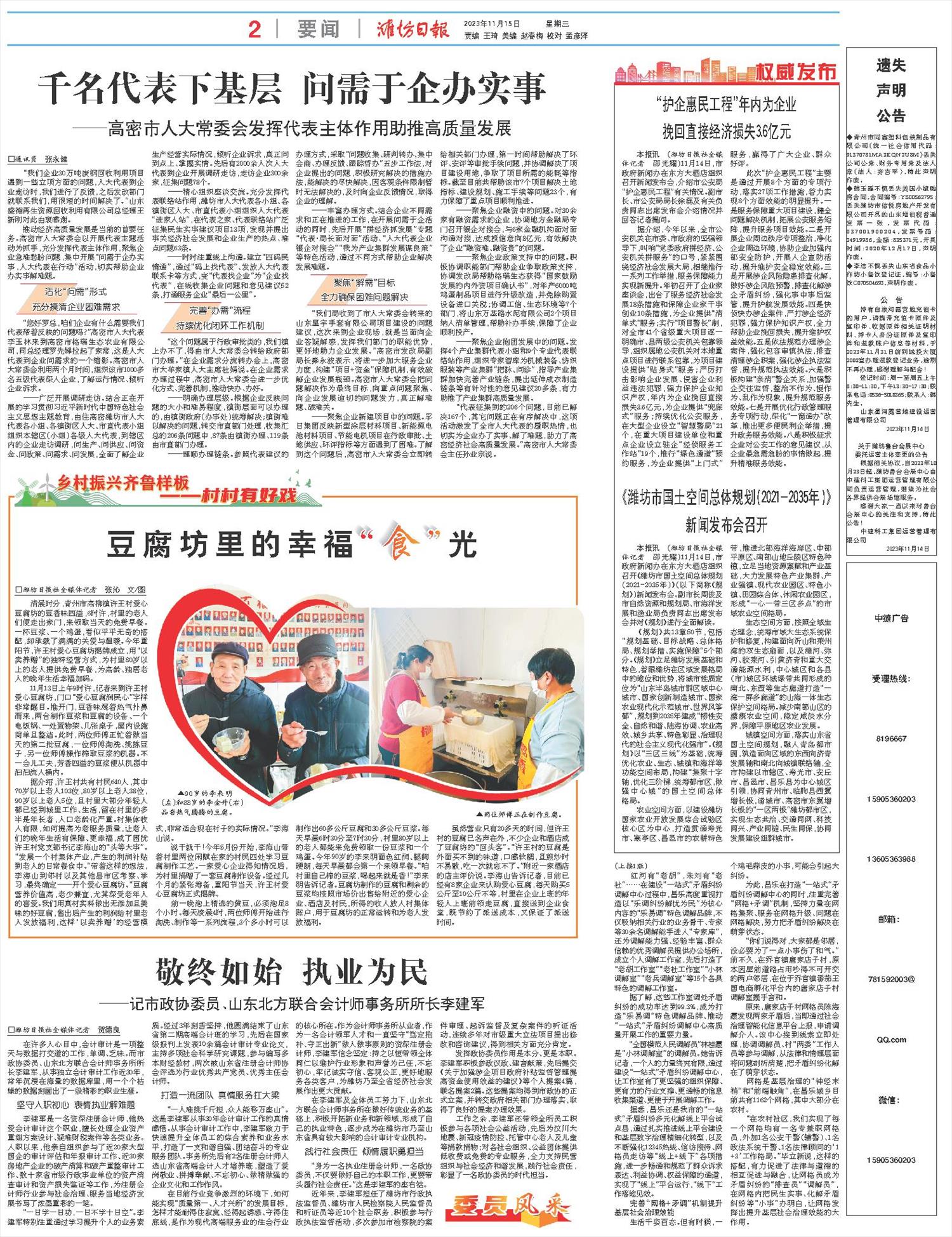 编者按 11月14日,农民日报头版头条刊发了《“四轮驱动”建设农业强市——山东省潍坊市打造齐鲁样板走在前做示范》,对我市以拓展创新“三个模式”为引领,按照农业强国建设要求,全力做强“科技驱动”和“改革驱动”两大主力引擎,立足农业产业化发源地和国家农业开放发展综合试验区的地方优势,聚力打造“龙头驱动”和“开放驱动”两个特色引擎,用“四轮驱动”加快农业强市建设的做法进行报道。本报予以转载,敬请读者关注。