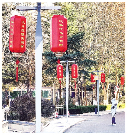 日前,富华巷道路两侧打造了以诗词灯笼为主题的街景,每个灯笼上写满了诗词,诗意浓浓扑面而来。图为12月20日,行人从富华巷悬挂的诗词灯笼前经过。