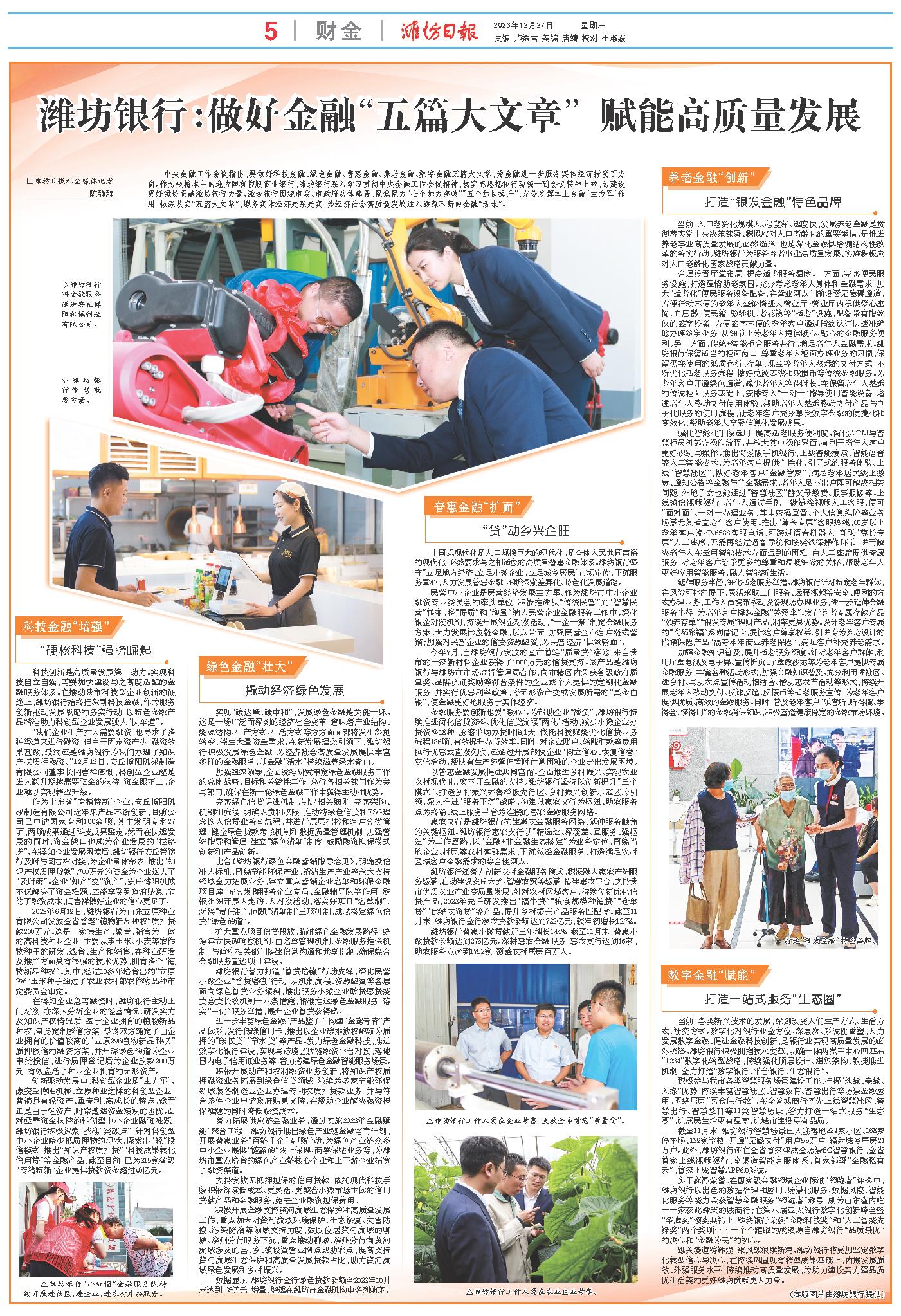 中央金融工作会议指出,要做好科技金融、绿色金融、普惠金融、养老金融、数字金融五篇大文章,为金融进一步服务实体经济指明了方向。作为根植本土的地方国有控股商业银行,潍坊银行深入学习贯彻中央金融工作会议精神,切实把思想和行动统一到会议精神上来,为建设更好潍坊贡献潍坊银行力量。潍坊银行围绕市委、市政府总体部署,聚焦聚力“七个加力突破”“五个加快提升”,充分发挥本土金融“主力军”作用,做深做实“五篇大文章”,服务实体经济走深走实,为经济社会高质量发展注入源源不断的金融“活水”。