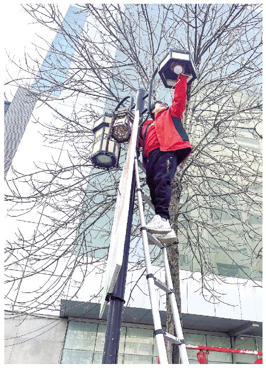 1月4日,在奎文区东关街道中和园社区,工作人员正在对路灯进行维修。连日来,该社区开展“维修路灯暖民心、照亮居民回家路”活动,对辖区所有路灯进行排查,消除安全隐患。