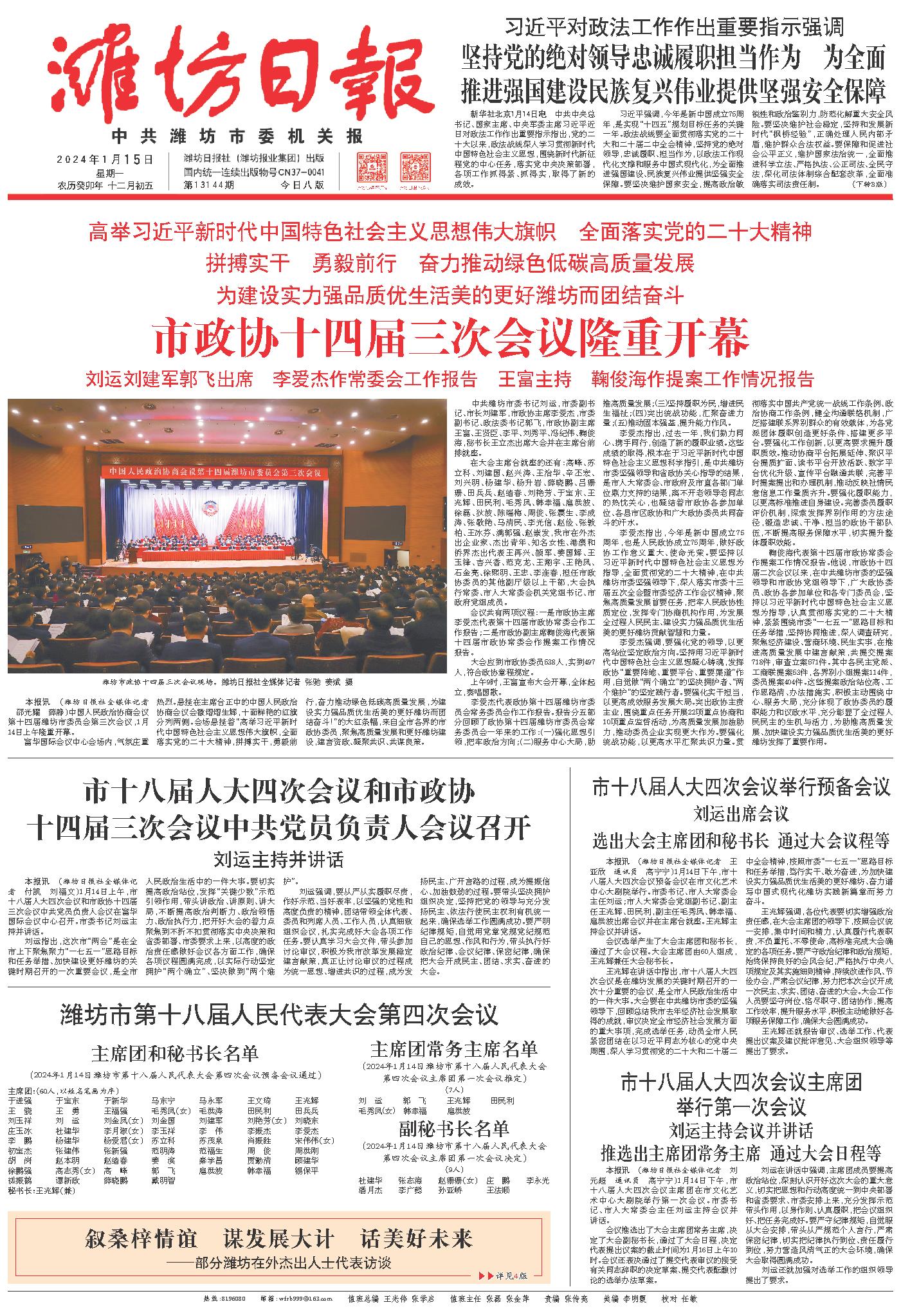 本报讯 (潍坊日报社全媒体记者 刘元超 通讯员 高宁宁)1月14日下午,市十八届人大四次会议主席团在市文化艺术中心大剧院举行第一次会议。市委书记、市人大常委会主任刘运主持会议并讲话。