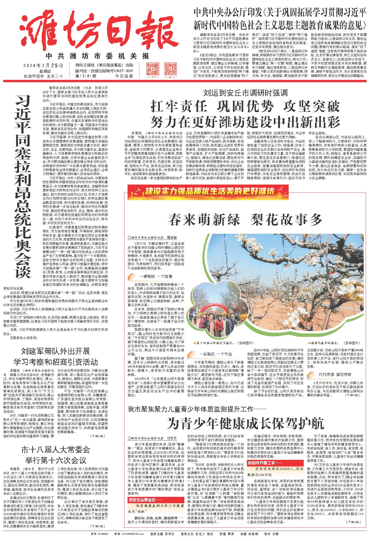 本报讯 (潍坊日报社全媒体记者 付凯 刘福文)2月28日上午,市委书记刘运到安丘市调研经济社会发展情况。他强调,要深入贯彻党中央决策部署和省委、省政府工作要求,认真落实全省高水平开放暨高质量招商引资大会精神,按照全市“比拼经济主战场,打好发展攻坚战”的动员部署,扛牢责任、巩固优势、攻坚突破,培育壮大产业,筑牢安全防线,努力在更好潍坊建设中出新出彩。市委常委、秘书长、统战部部长赵绪春参加。