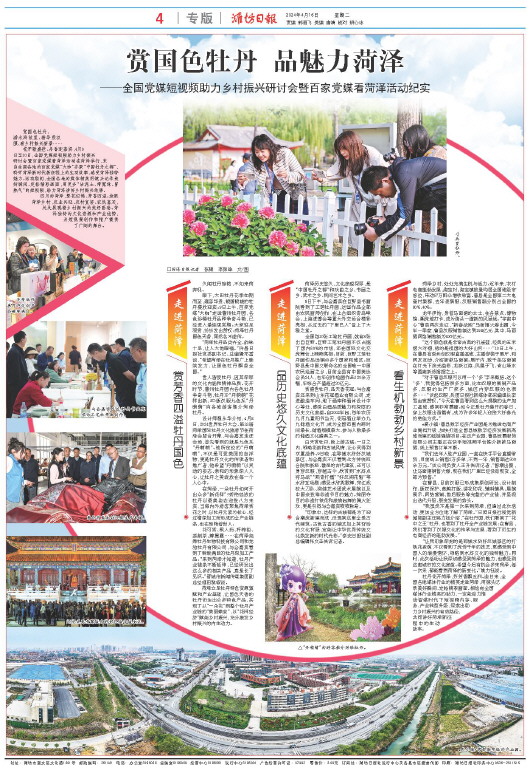 花开歌盛世、丹香迎嘉宾,4月9日至10日,全国党媒短视频助力乡村振兴研讨会暨百家党媒看菏泽活动在菏泽举行,来自全国各地的百家党媒“大咖”齐聚“中国牡丹之都”,聆听菏泽新时代新征程上的生动故事,感受菏泽独特魅力。活动期间,全国各地的媒体精英用镜头记录美好瞬间、定格精彩画面,用更多“沾泥土、带露珠、冒热气”的短视频,助力菏泽讲好乡村振兴故事。