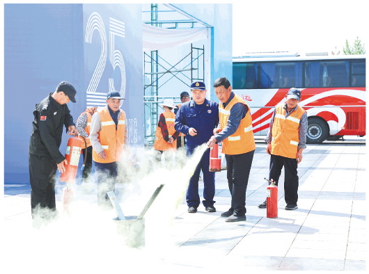检查过程中,消防人员重点针对场馆消防控制室控制设备运行情况、疏散通道和安全出口畅通情况、消防灭火器材配备情况等进行了细致检查。随后,向场所工作人员讲解了消防知识,并演示了灭火器的使用方法,为本届菜博会消防安全保卫工作奠定了基础。图为消防人员指导工作人员正确使用灭火器。