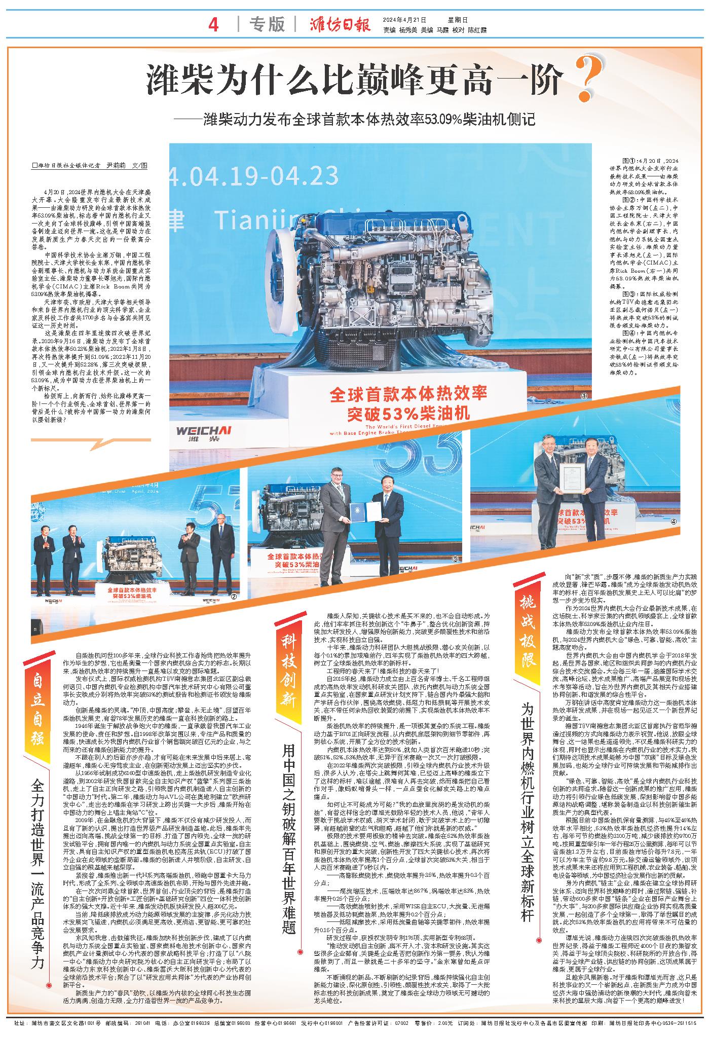 4月20日,2024世界内燃机大会在天津盛大开幕。大会隆重发布行业最新技术成果——由潍柴动力研发的全球首款本体热效率53.09%柴油机,标志着中国内燃机行业又一次走向了全球科技巅峰,引领中国高端装备制造业迈向世界一流。这也是中国动力在发展新质生产力春天交出的一份最高分答卷。