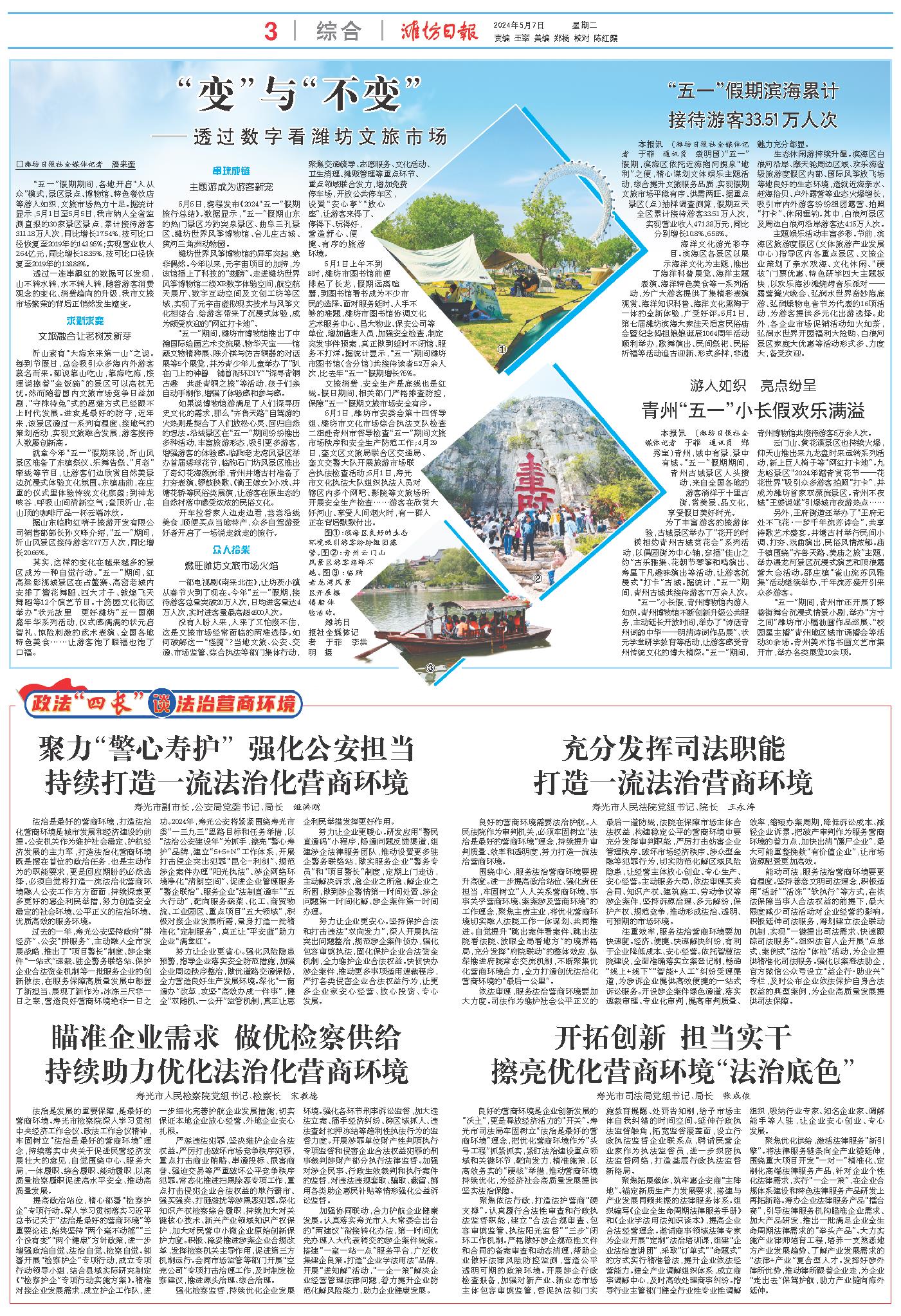 本报讯 (潍坊日报社全媒体记者 于菲 通讯员 袁明国)“五一”假期,滨海区依托近海抱河揽泉“地利”之便,精心谋划文体娱乐主题活动,综合提升文旅服务品质,实现假期文旅市场平稳有序、供需两旺。据重点景区(点)抽样调查测算,假期五天全区累计接待游客33.51万人次,实现营业收入471.38万元,同比分别增长10.8%、6.58%。