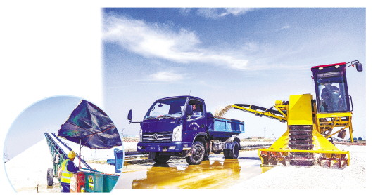 进入五月,滨海区各大盐场“头耙盐”进入收捞季节。记者在山东海化集团羊口盐场制盐三场看到,盐池里,车轮滚滚、马达轰鸣,工人们操作着各种机械设备抓紧抢收原盐,一车车洁白晶莹的原盐被运到坨台上,堆起了一座座高高的“盐山”,处处都是原盐丰收的繁忙景象。