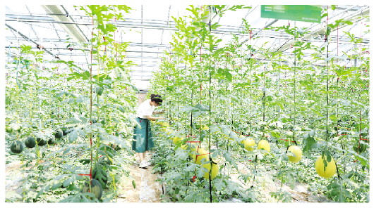 昌乐县集聚科技人才、科研院所等资源,聚焦品种培优,努力打造瓜类种业“硅谷”。昌乐西瓜科技示范园新品种试验示范基地实施西瓜良种繁育与示范种植等4个种业研发项目,截至目前,已培育西(甜)瓜新品种14个,取得农作物品种登记32个。图为昌乐西瓜科技示范园的工作人员在管理试种的“金嘉童”小型西瓜。