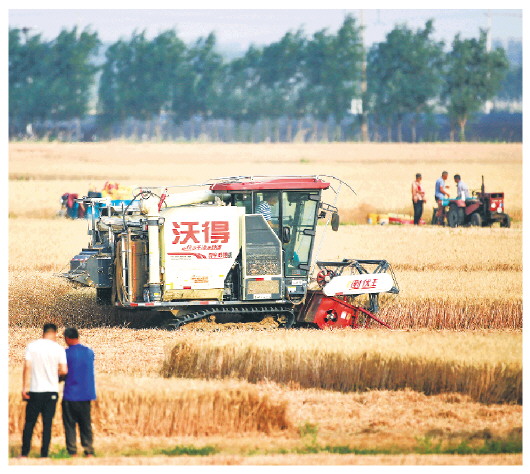 6月14日早上6点,在寒亭区高里街道小庄子村,几位粮农正查看麦粒的成色。在他们身边的麦田里,大型联合收割机往来穿梭,将一畦畦金黄的麦子收割、脱粒,然后卸装到运输车上。时下已进入雨季,我市各地正抢抓农时开展麦收工作,确保粮食颗粒归仓。