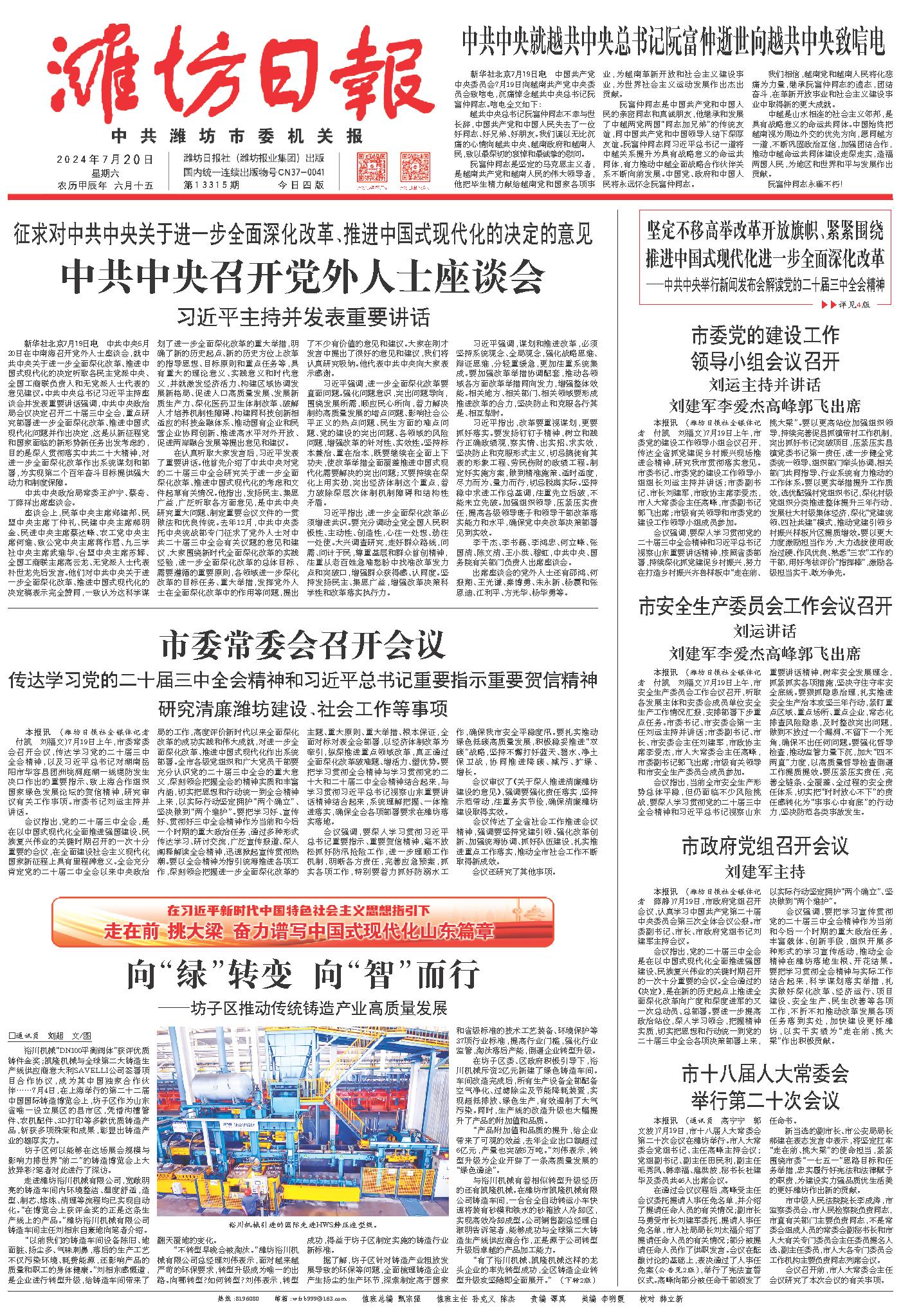 本报讯 (潍坊日报社全媒体记者 付凯 刘福文)7月19日上午,市委党的建设工作领导小组会议召开,传达全省抓党建促乡村振兴现场推进会精神,研究我市贯彻落实意见。市委书记、市委党的建设工作领导小组组长刘运主持并讲话;市委副书记、市长刘建军,市政协主席李爱杰,市人大常委会主任高峰,市委副书记郭飞出席;市级有关领导和市委党的建设工作领导小组成员参加。
