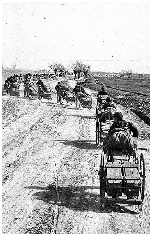 在淮海战役的第二和第三阶段,我们平东县的小车队继续跟着第七纵队征战,在江苏、安徽、河南交界的丰县、沛县、萧县、砀山县、永城县之间转悠来转悠去。我记得淮海战役打了两个多月(淮海战役自1948年11月6日开始至1949年1月10日结束)。在淮海战役打得激烈的时候,我们的小车分队总共向前线运送了四趟粮食。白天有敌人的飞机轰炸,不敢走,就夜里走,到前线一个来回,要走约80里路。我们两个出工的,一个拉车,一个推车,过会儿再换过来,黑灯瞎火的,紧赶慢跑,总算完成了任务。