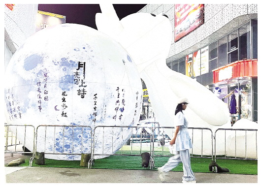 9月7日,在高新区健康东街一商场门前,市民从中秋街景前经过。临近中秋节,各类中秋节题材的街景纷纷亮相街头,营造出浓浓的节日氛围。潍坊日报社全媒体记者 张驰 摄