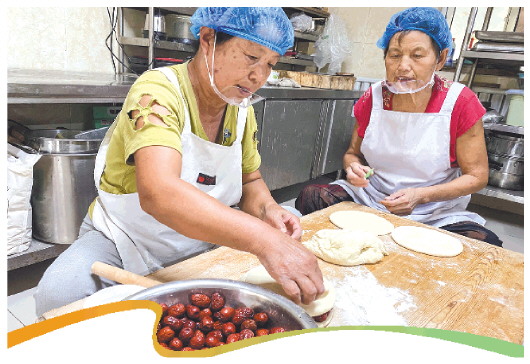“出锅喽!”在热气腾腾的雾气中,项永芳的老伴丁洪章又把一锅脂饼和豆沙包从蒸箱里端了出来,空气中瞬间弥漫着面粉香味。在加工车间的一旁,两名工人正在忙着制作“月儿”。和面、发面、捏花儿、蒸月,每一道工序都认真严谨。“我们一直坚持使用自磨面粉,纯手工加工制作,做‘月儿’用的红枣也是选用的优质大枣,做出来的‘月儿’造型好看,口感筋道。”项永芳说,虽然现在超市里各色美食应有尽有,但还是有很多人喜欢吃“月儿”,因为“月儿”寄托了浓浓的乡情和对美好生活的憧憬。