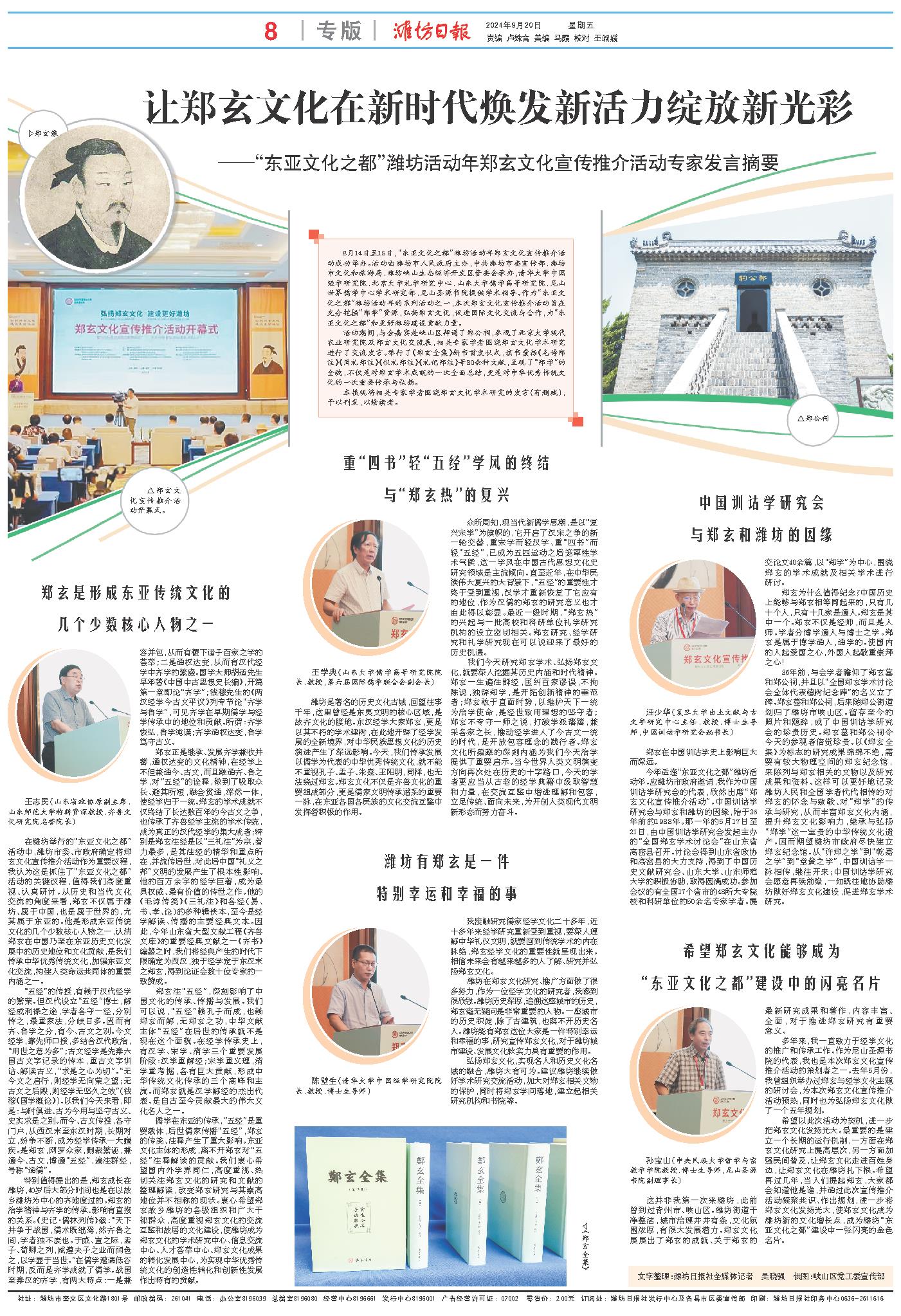 8月14日至15日,“东亚文化之都”潍坊活动年郑玄文化宣传推介活动成功举办。活动由潍坊市人民政府主办,中共潍坊市委宣传部、潍坊市文化和旅游局、潍坊峡山生态经济开发区管委会承办,清华大学中国经学研究院、北京大学礼学研究中心、山东大学儒学高等研究院、尼山世界儒学中心学术研究部、尼山圣源书院提供学术指导。作为“东亚文化之都”潍坊活动年的系列活动之一,本次郑玄文化宣传推介活动旨在充分挖掘“郑学”资源,弘扬郑玄文化,促进国际文化交流与合作,为“东亚文化之都”和更好潍坊建设贡献力量。