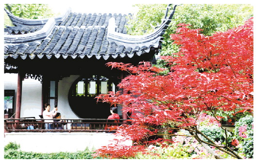 图为10月20日游客在江苏苏州留园赏景游玩。 (新华社发)