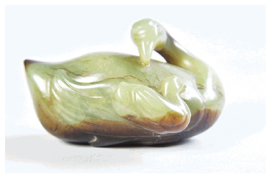 我也有驰骋于草原的经历。宋代,北方契丹民族和女真民族喜欢佩戴大雁或天鹅造型的玉佩。工匠往往随着籽玉的天然形状雕琢,或曲颈或回首。我变身的一件玉鹅,全身收拢,曲颈回顾,几条阴线成翅膀,简单而古朴,发出淡淡的绿光。如今,从原野到宫廷到海岛,我静静躺卧在台北故宫博物院。