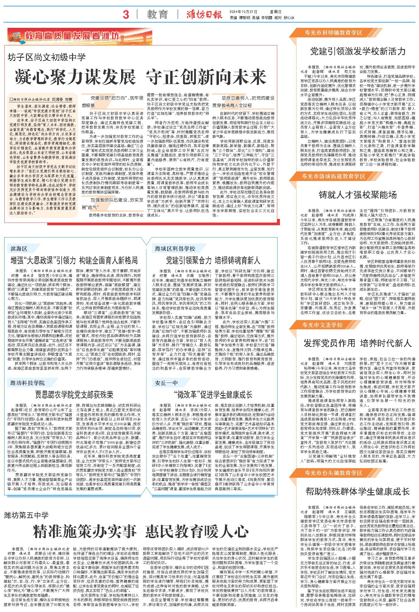 坊子区尚文初级中学党总支副书记杜增东表示:“我们以党建引领为驱动核心,融合多年的办学历史与深厚的文化底蕴,根据学生成长需求,精心打造以党建为引领的教育教学特色品牌。在此过程中,学校充分发挥党员干部的积极性和创造力,将品牌建设与学校的办学治校理念紧密结合,与教育教学工作、学生德育工作以及教师队伍建设深度融合,不断激发学校党建品牌的活力与影响力,为教育高质量发展注入强劲动力。”