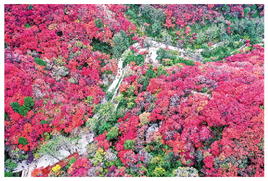 霜降过后,临朐县石门坊风景区进入漫山红叶的最佳观赏季,从空中俯瞰,红黄绿相互映衬,构成了一幅美妙的秋日画卷,吸引了众多游客前往观赏。图为10月26日,石门坊风景区的红叶。