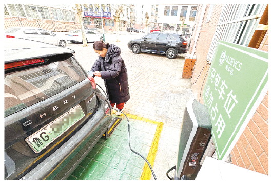 12月24日,在潍城区城关街道颐园社区,居民利用共享充电桩给自己的爱车充电。日前,该社区主动联系电力、消防等部门,勘察确定社区规划内的地形位置,合理安排设置了4台共享充电桩,既解决了新能源汽车充电难的问题,又有效消除了“飞线”充电等相关安全隐患,受到了居民们的欢迎。 记者 张驰 摄