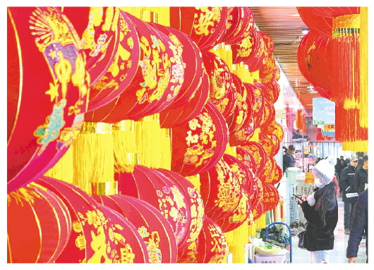 1月16日,在潍坊商品城,市民正在选购大红灯笼。随着春节的临近,纸质的、绒布的、纱布的、成串的等各式各样的大红灯笼被高高挂在商铺最显眼的位置。一家销售大红灯笼的商家告诉记者,春节前,传统款式的大红灯笼销售最火爆,大红灯笼象征着阖家团圆、事业兴旺、红红火火,家中门前挂起大红灯笼,可以为节日增添喜庆氛围。 记者 张驰 摄