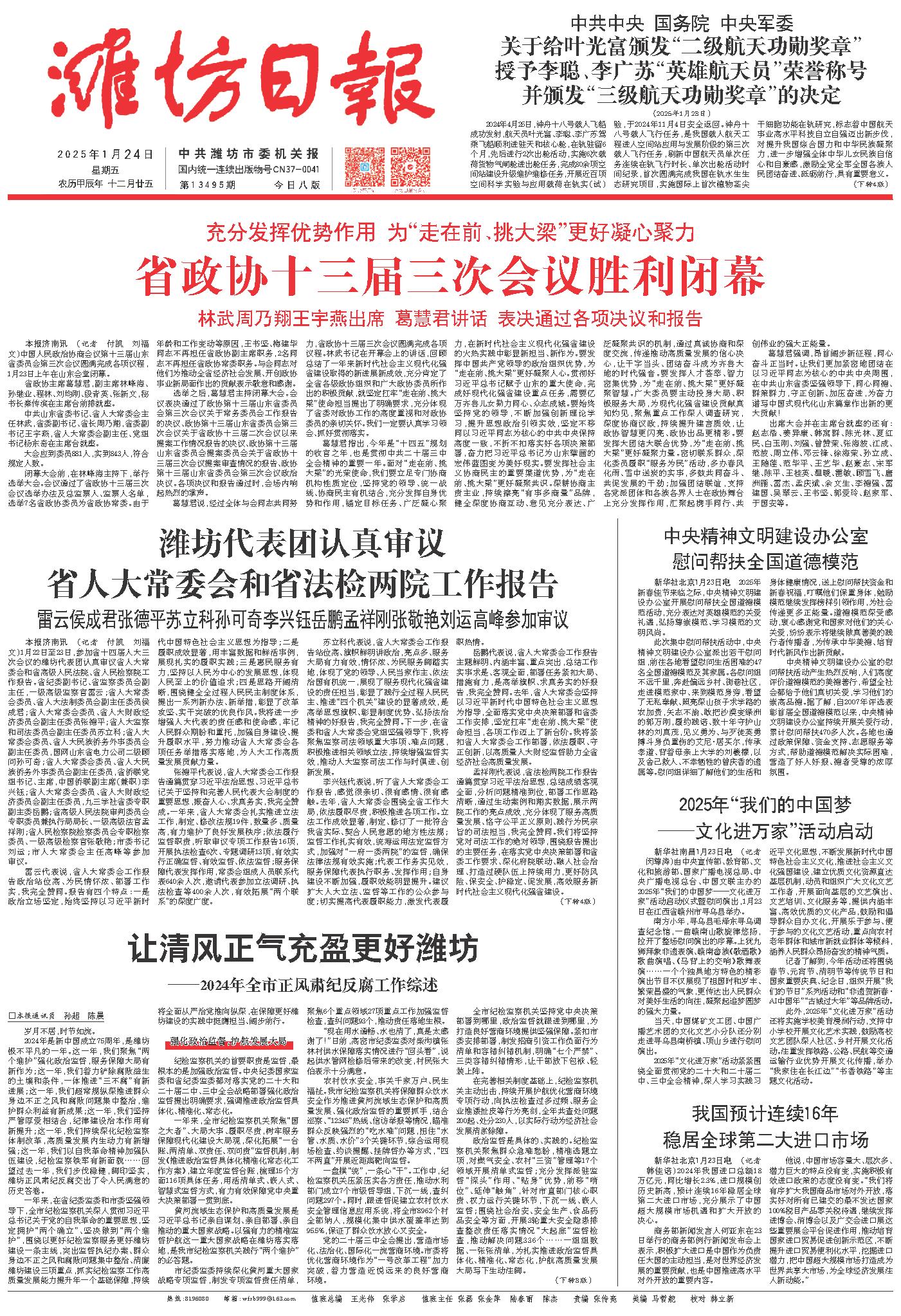 2024年是新中国成立75周年,是潍坊极不平凡的一年。这一年,我们聚焦“两个维护”强化政治监督,服务保障大局有新作为;这一年,我们着力铲除腐败滋生的土壤和条件,一体推进“三不腐”有新进展;这一年,我们超常规纵深推进群众身边不正之风和腐败问题集中整治,维护群众利益有新成果;这一年,我们坚持严管厚爱相结合,纪律建设治本作用有新提升;这一年,我们持续深化纪检监察体制改革,高质量发展内生动力有新增强;这一年,我们以自我革命精神加强队伍建设,纪检监察铁军有新面貌……回望过去一年,我们步伐稳健,脚印坚实,潍坊正风肃纪反腐交出了令人民满意的历史答卷。
