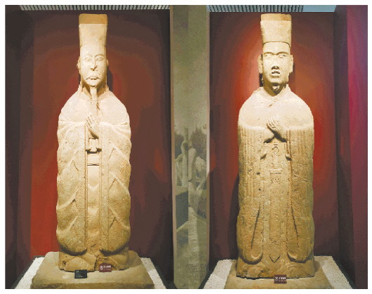 武将石俑同样有两尊,也是青石质,圆雕。左边的高318厘米,右边的高302厘米。武将头戴官帽,弯眉大眼,高挺的鼻梁,大大的耳朵,双唇微闭,三缕长髯自然下垂,面容瘦削却威严十足。他们身着圆领官服,腰结宽带,广袖垂及膝下,双手于胸前交叉握剑,剑身自然下垂于身前,脚蹬云靴,整体神态威武庄重。