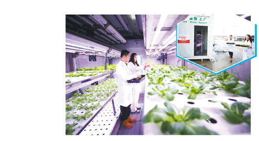 图①:技术人员在集装箱“植物工厂”内对蔬菜幼苗进行“定植”。