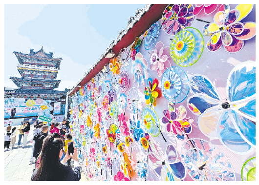 4月6日,记者在城区十笏园文化街区采访时看到,一组高3.5米、长10米的风车造型景观吸引了众多游客的目光。300多个造型各异、颜色艳丽的风车随风旋转,春日气息扑面而来,给人们带来极佳的视觉体验。 记者 张驰 摄