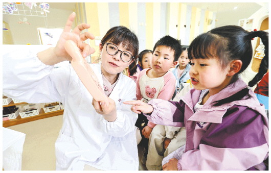 4月7日,在浙江省湖州市德清县三桥幼儿园,德清县中医院医生给孩子讲解中医针灸穴位知识。