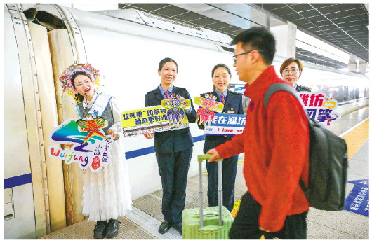 >4月16日,北京南站工作人员在“潍坊风筝号”旅游专线列车前欢迎乘客。