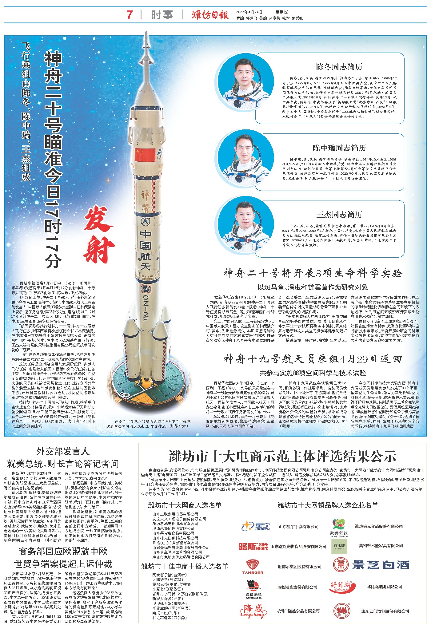 据新华社酒泉4月23日电 (米思源 刘磊)记者从23日召开的神舟二十号载人飞行任务新闻发布会上获悉,神舟二十号任务将以斑马鱼、涡虫和链霉菌作为研究对象,开展3项生命科学实验。