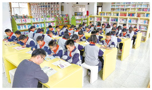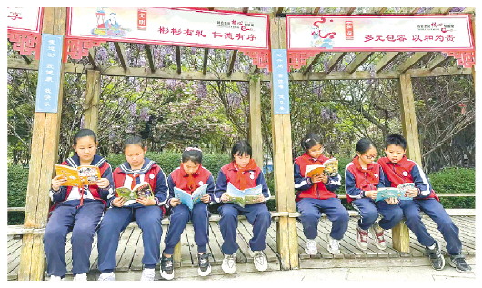 在读书月活动期间,寒亭区杨家埠小学践行“随时随地阅读”理念,学校通过“阅读打卡”“漂流书架”等趣味活动,引导学生利用碎片化时间阅读,掀起校园阅读热潮。图为孩子们在校园的花园亭台读书。 通讯员 李媛媛 摄