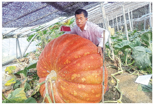李守太原先在机关事业单位上班,退休后返乡当起了一名“新农人”。与其他菜农不同,他依托以往的农业工作经验独辟蹊径,和妻子用自家大棚种植观光型巨型南瓜,今年喜获丰收,超过500斤的达13个。