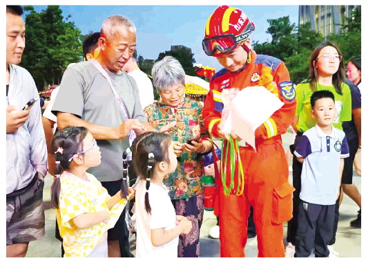 为确保夜市经营平稳有序、市民游玩无忧,市消防救援支队推行“夏季夜市消防专项执勤计划”,联合属地街道、派出所,启动“人防+技防”常态化夜巡。图为近日凤溪地万物集夜市上,市民在游戏中学习消防安全知识。 记者 张韶华 摄